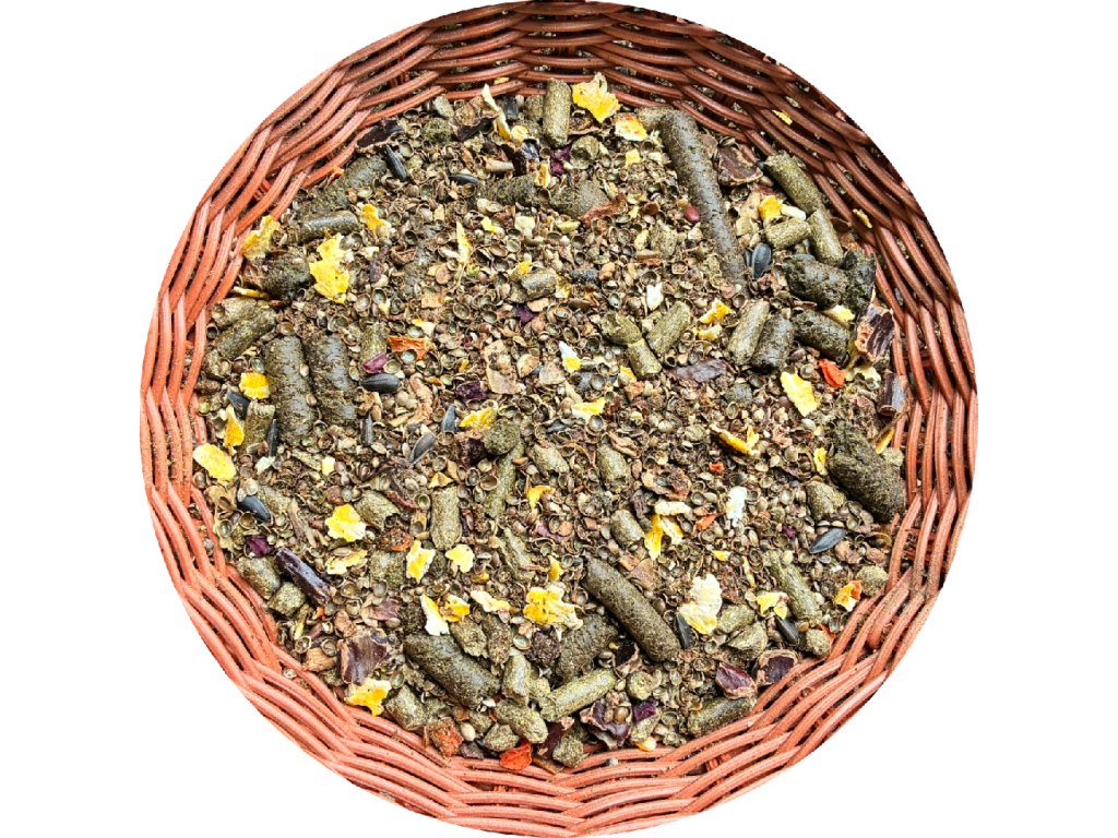 Extrudovaný len spolu s lněným olejem přináší důležité omega-3 mastné kyseliny, které prospívají srsti i pokožce. Kukuřičné vločky, hydrotermicky upravené pro lepší stravitelnost, dodávají energii s nízkým obsahem cukrů. Sušená mrkev a červená řepa obohacují směs o vlákninu a antioxidanty, které podporují imunitní systém. Karob přispívá k udržení rovnováhy v trávicím traktu, zatímco jablečné výlisky zvyšují atraktivitu a chuť krmiva.