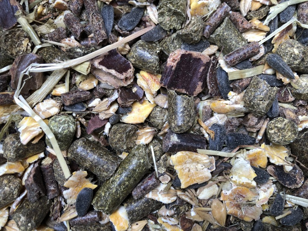 Složení: Vojtěškové pelety, kukuřičné vločky, slunečnice, karob, řezanka, vlákninové granule, ječné vločky, lněné semeno, jablečné výlisky, rostlinné oleje.